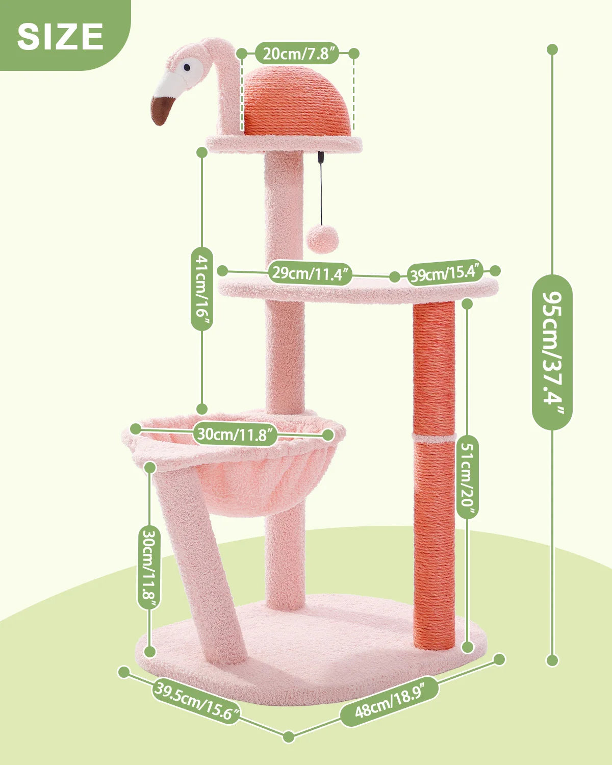 2. Multifunctional Flamingo Climbing Tree: Equipped with 2 pink full-sisal scratching posts and 1 full-sisal ball φ20cm=7.87inch, this flamingo-shaped cat tree meets all your cat's scratching needs. The 100% natural sisal semi-circular body offers cats a comfortable scratching posture and a satisfying scratch experience.