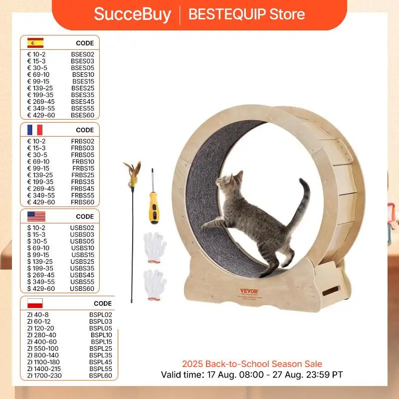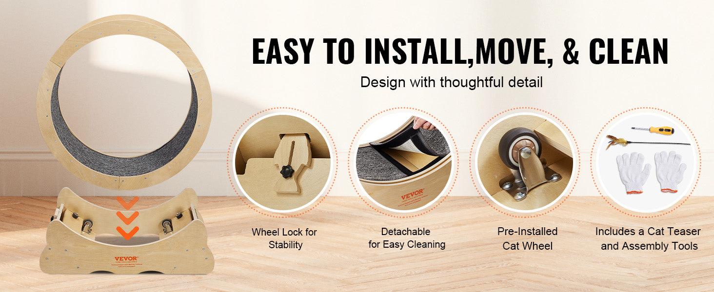 - User-Friendly Design: Easy installation with pre-installed expansion screws and wheel, saving you valuable time. Included accessories like gloves, a screwdriver, and a cat teaser add extra convenience. This cat treadmill is a breeze to clean with a non-scratch detachable looped mat, easily spot-cleanable with a cloth or sponge.