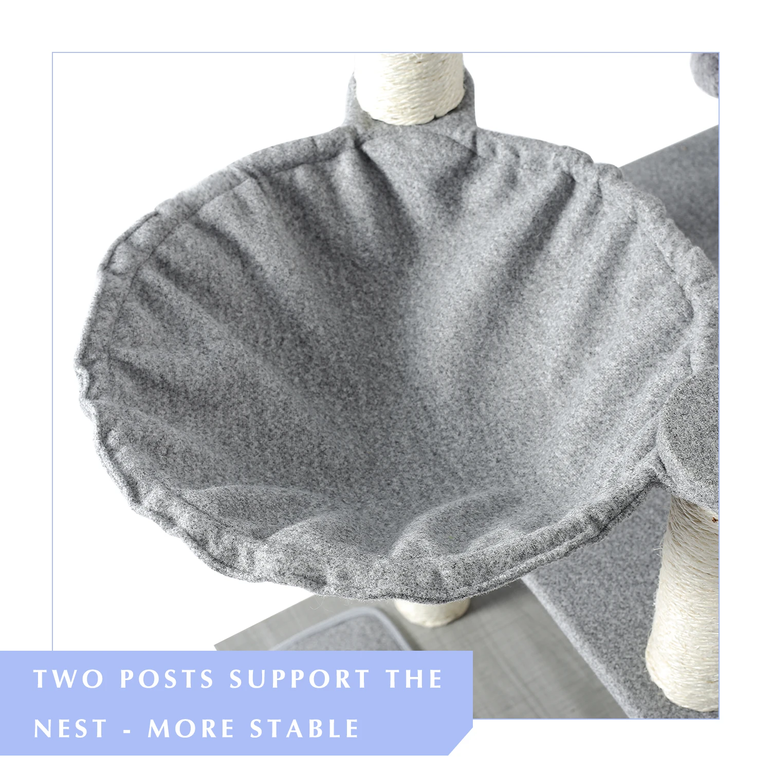 ACTIVITY CENTER OF CATS- There are 1 lovely cat houses, 1 spacious perches,1 hammock, 6 scratching posts covered by grey sisal, 4 posts covered by thick felt cloth, 1 hanging sisal rope... Offer cats lots of acticity options. The 4 floors design meets the jumping nature of the cat. They can jump, have a rest or play with friends in it.