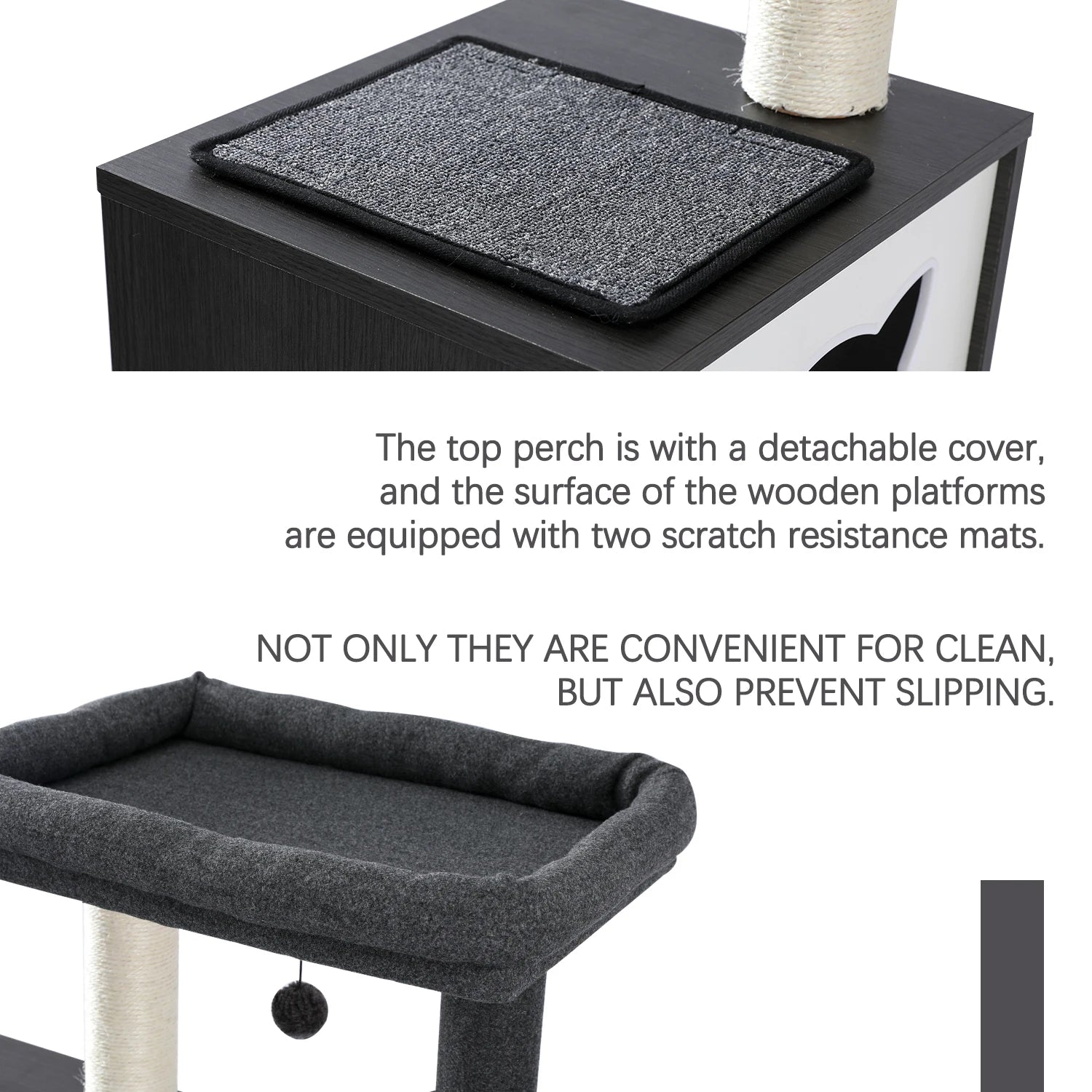 MATERIAL OF HIGH QUALITY- High density veneer board, smooth and sturdy. Thickened natural gray sisal. Thickened felt cloth offers different sense of scratching. 1 comfortable cushions inside the lovely cat house and 1 spacious top perches are removable and machine washable, soft and easy to clean.