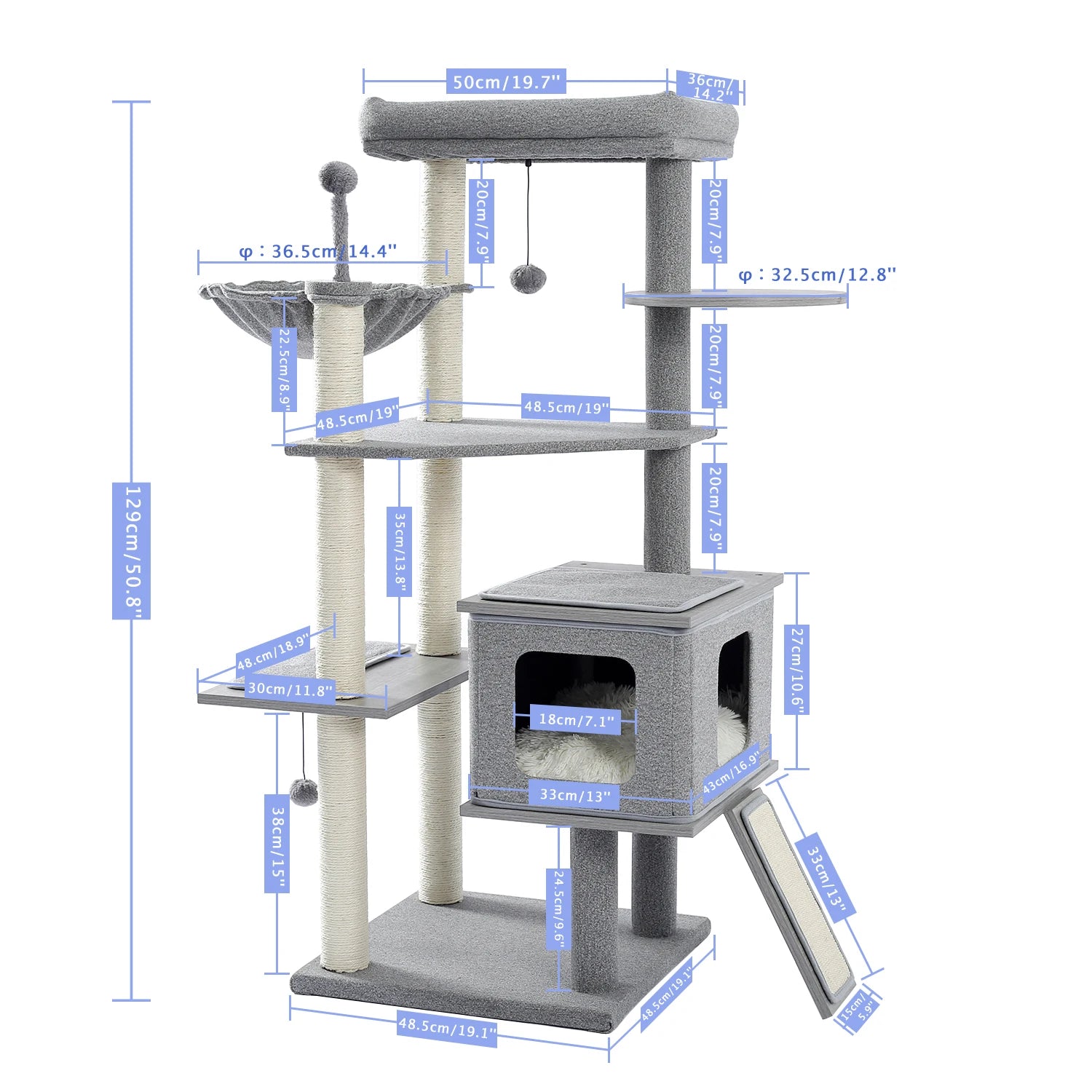EASY CARE & SUPERIOR MATERIAL: 50 Inch Cat Tree combines woolen with wooden style, not only the appearance is nice and generous but also easy to clean. It comes with a soft plush cushion in condo, two removable mats on the platform, a removable fully sisal wrapped mats on the ramp and six cover-sisal wrapped scratching posts, a spring ball, while providing more fun for cats, the convenience of cleaning is also considered.