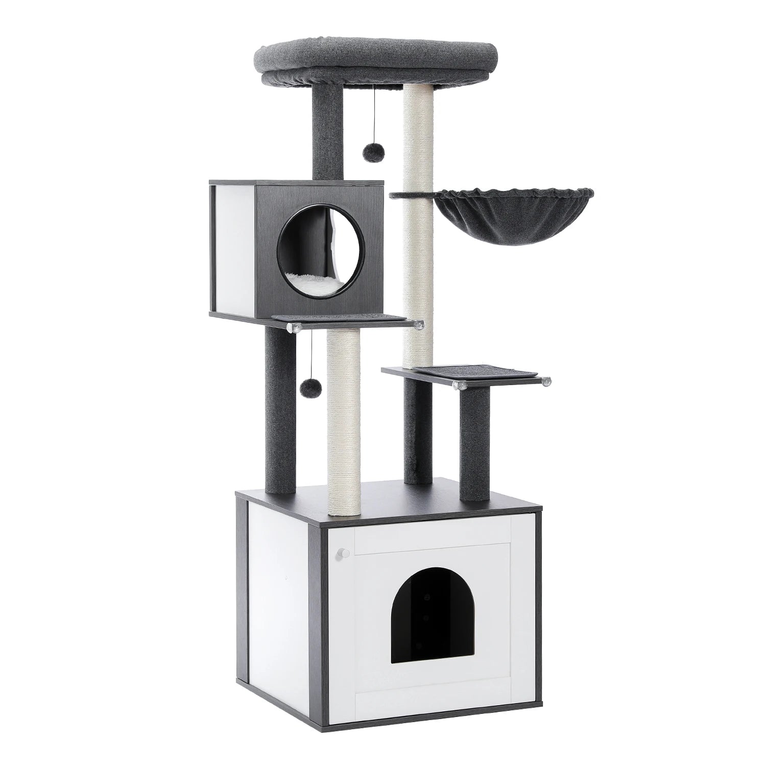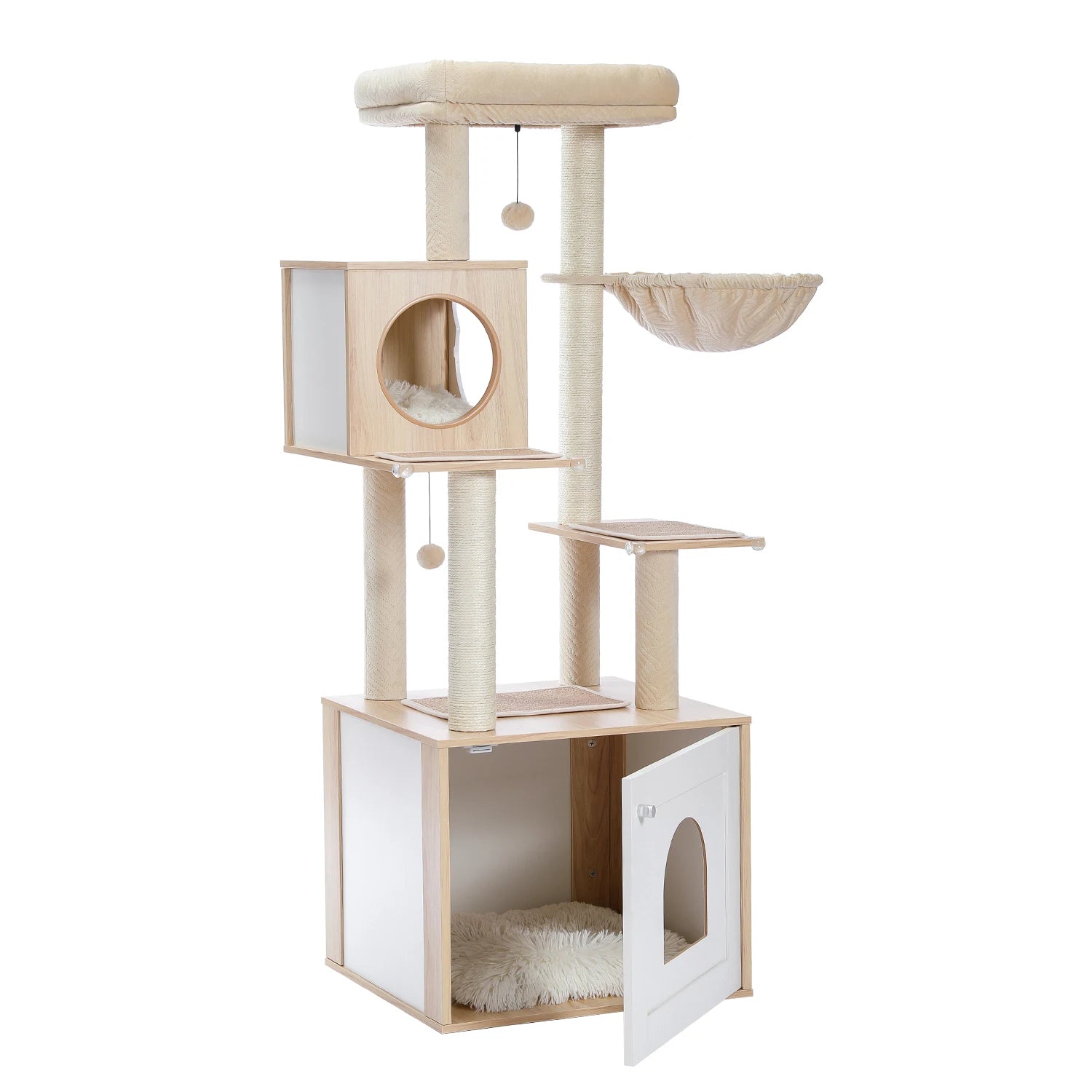 Litter Box Enclosed Cabinet: A combination of litter box enclosure and modern cat tree, you can put litter box into this cabinet, save some space while locking odor inside the box. Also, owners can put cat toys and other pet supplies into the cabinet instead or add a mat to it and use it as another large condo.